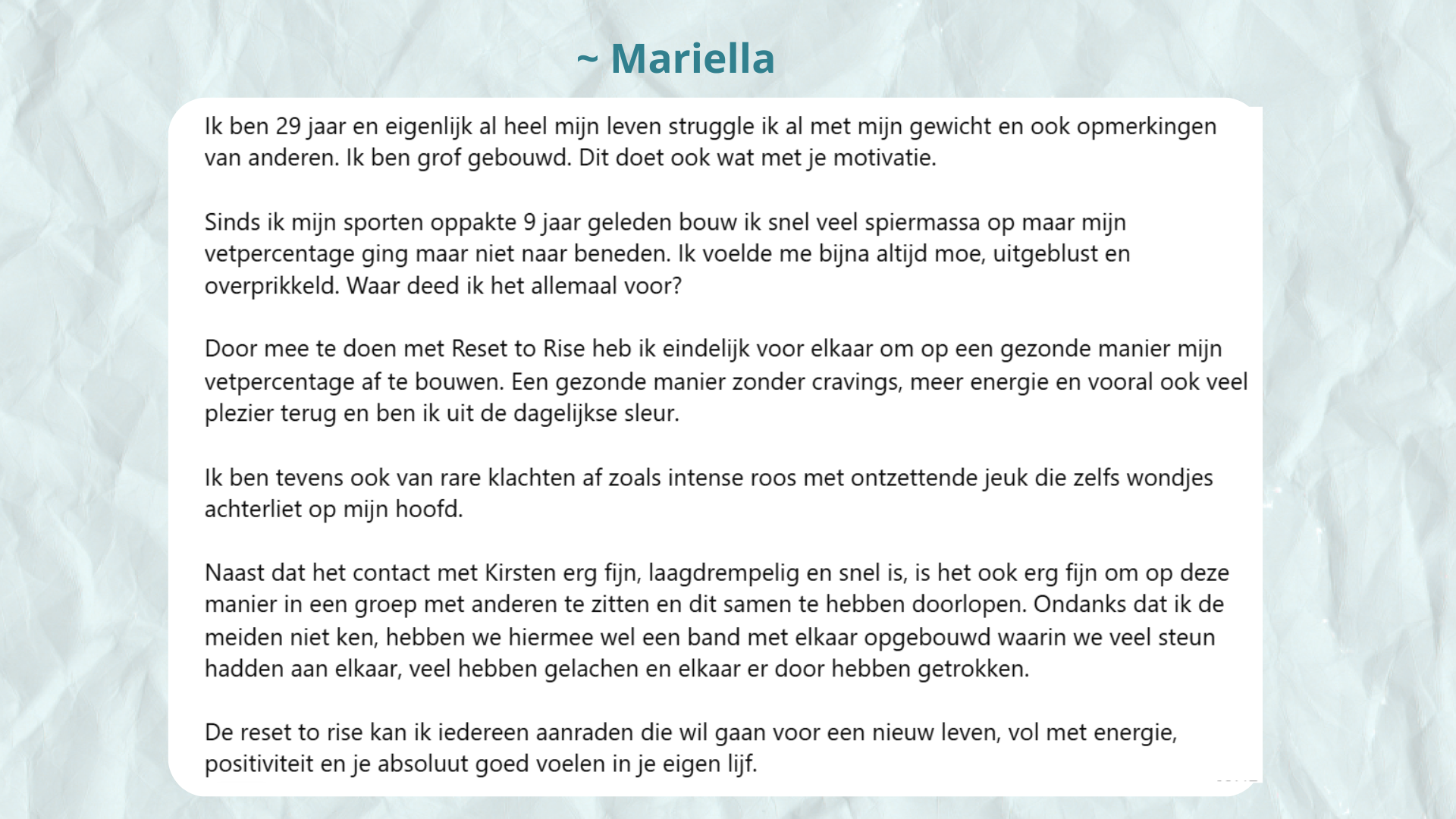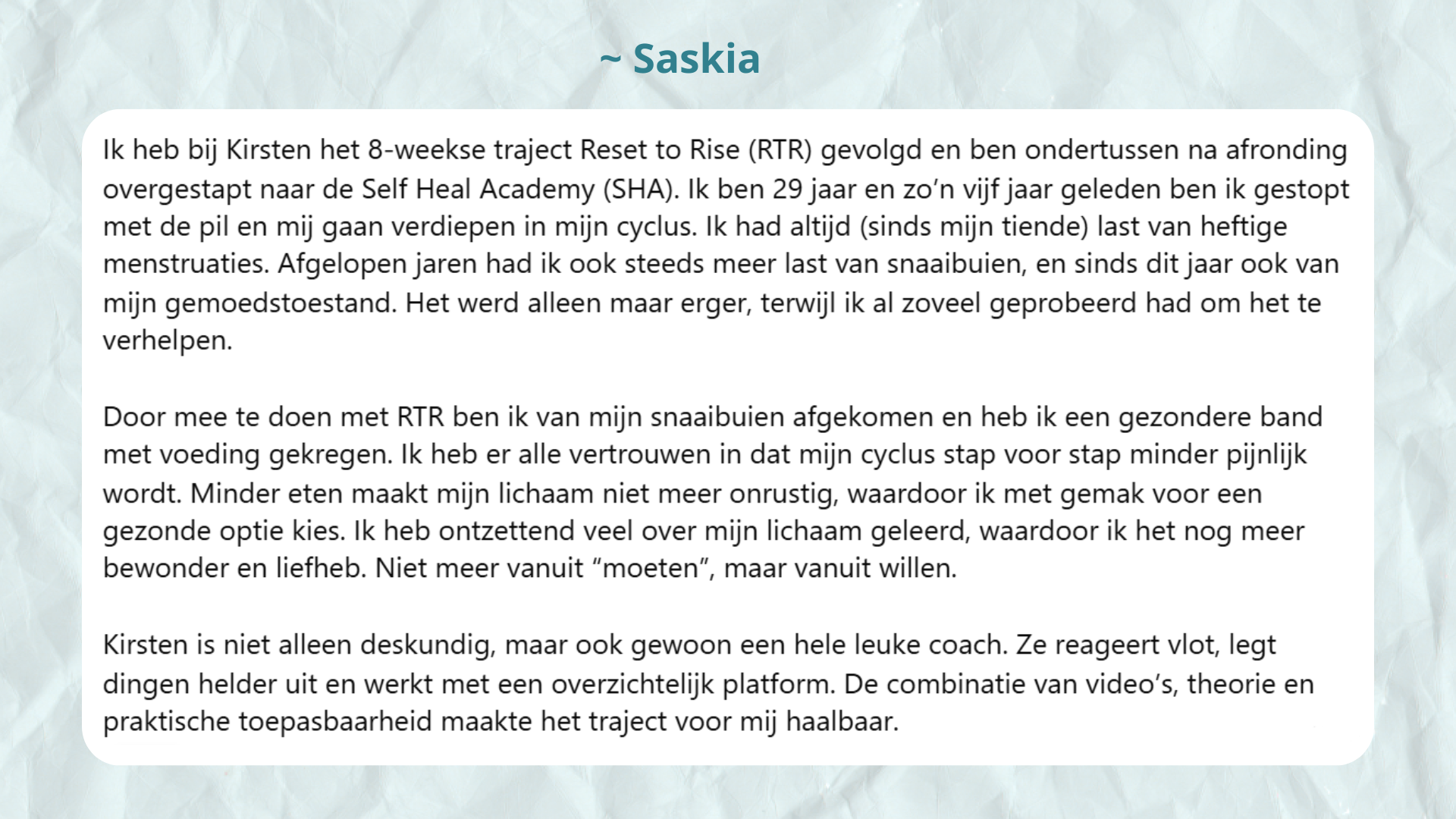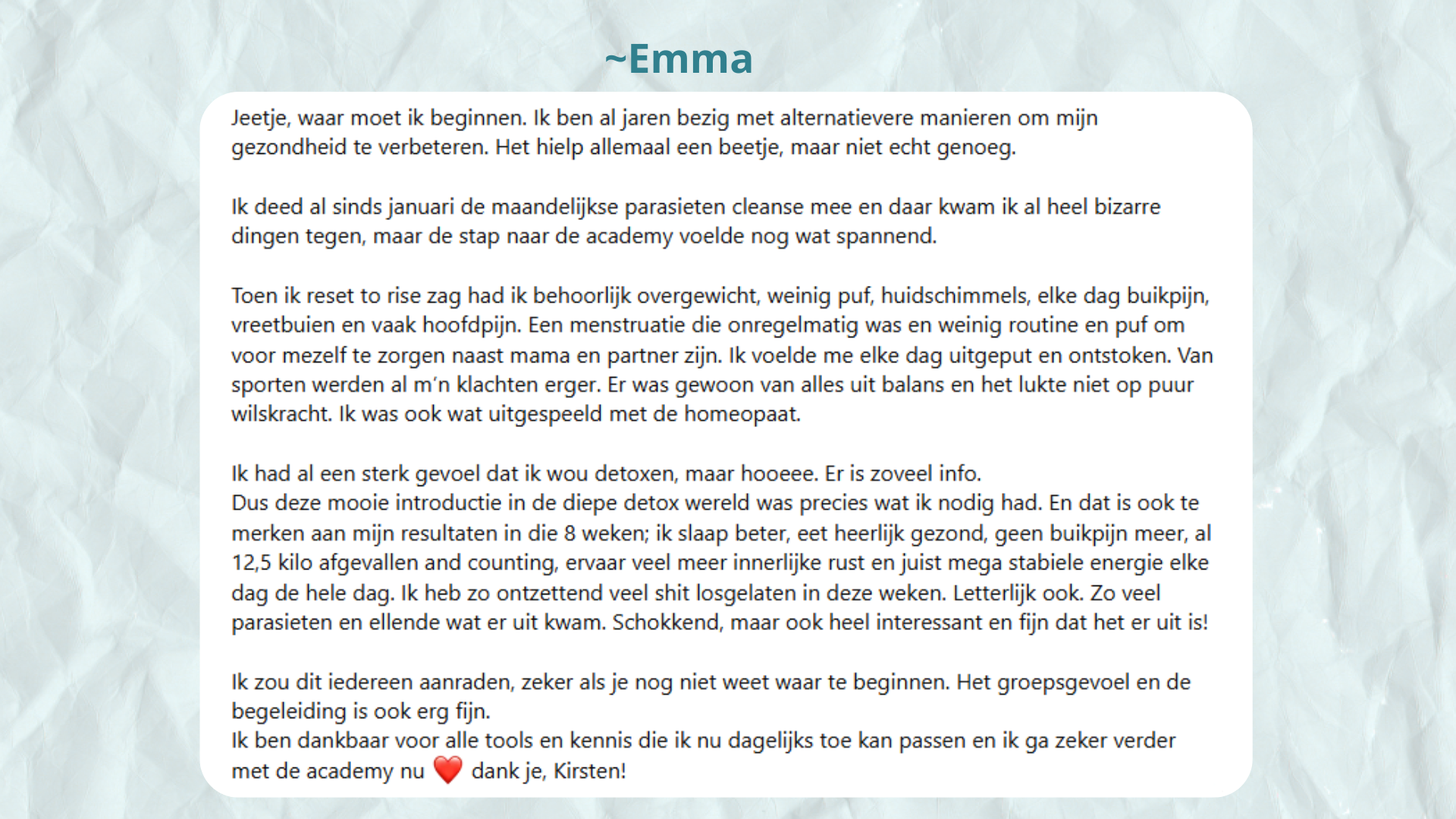 Ik viel niet alleen ruim 18 kilo af, ook mijn chronische pijn verdween en mijn darmen & buik werden rustig. Ik leerde ook weer samen te werken met mijn lijf & blij te zijn met wat het allemaal voor mij doet. Dát is wat ik jou ook gun.