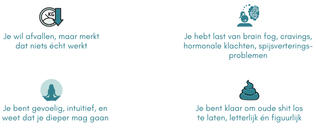 Voor jou! Voor de vrouw die steeds maar hoort “gewoon minder eten en meer bewegen” maar diep van binnen weet dat dat niet haar antwoord is. Voor de vrouw die maar blijft sukkelen met vage klachten, chronische pijn maar geen echte diagnose kan vinden. Je bent welkom om deze 8 weken door te brengen, omringd met vrouwen, inclusief mijzelf, die weten hoe jij je voelt!